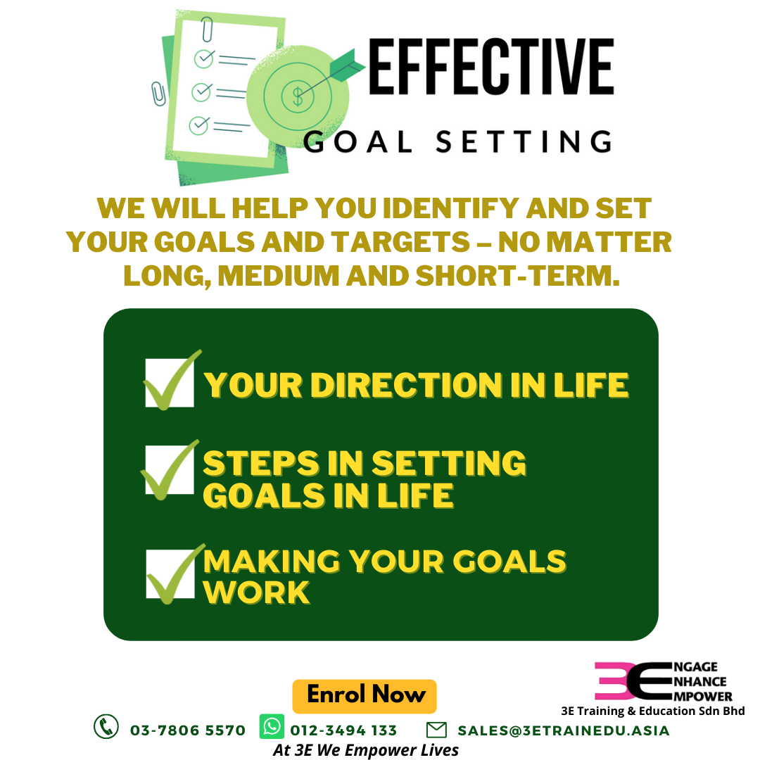 Objective: To help the participants identify and set their goals and targets – long, medium and short-term. They will also learn a systematic approach to implement and monitor their progress in reaching their goals.