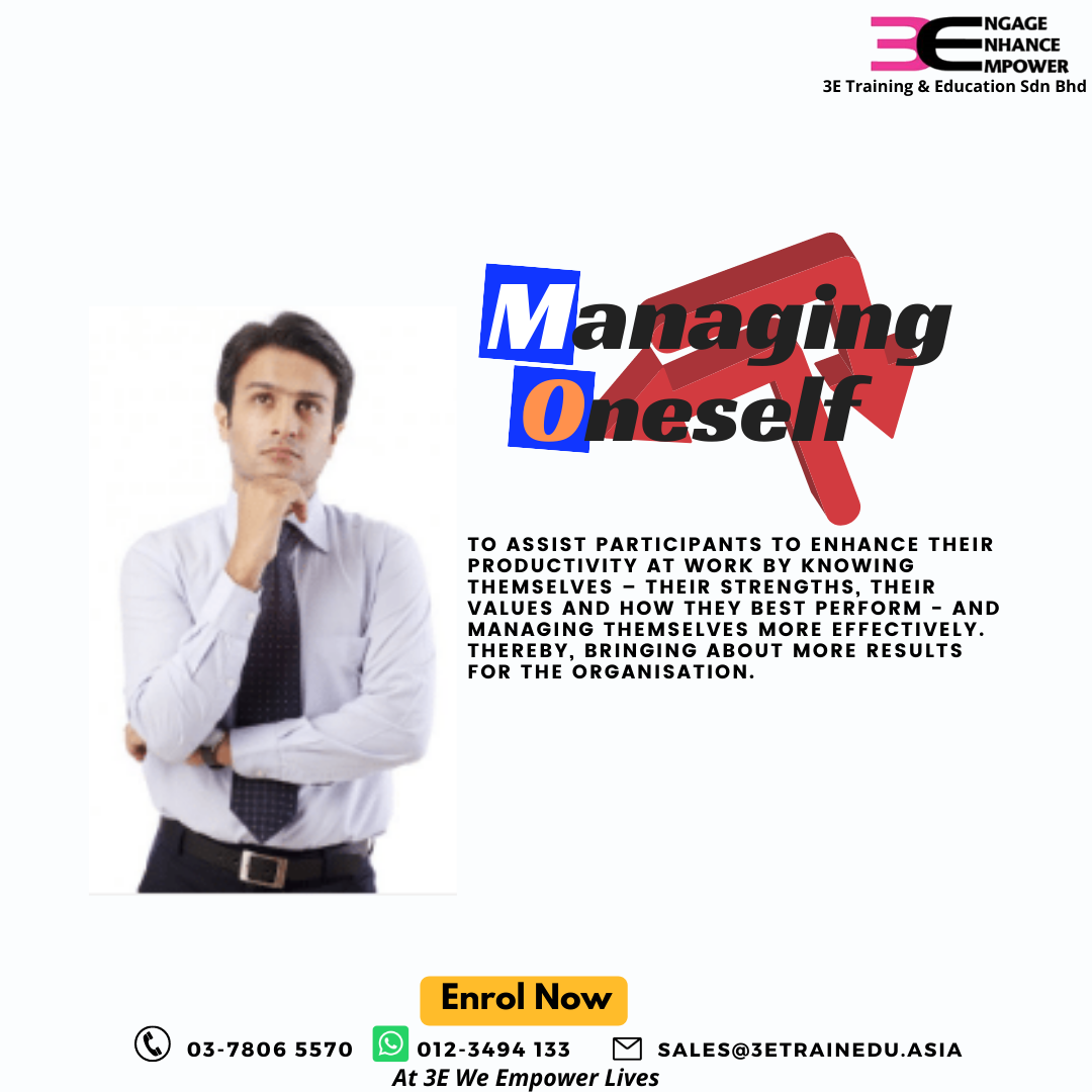 To assist participants to enhance their productivity at work by knowing themselves – their strengths, their values and how they best perform - and managing themselves more effectively. Thereby, bringing about more results for the organisation.
