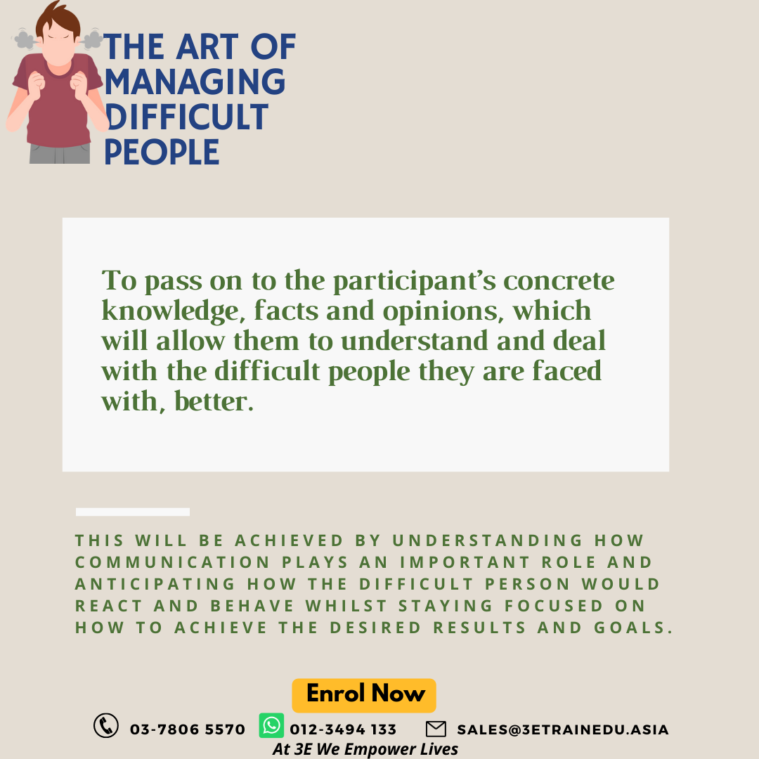 To pass on to the participant’s concrete knowledge, facts and opinions, which will allow them to understand and deal with the difficult people they are faced with, better. This will be achieved by understanding how communication plays an important role and anticipating how the difficult person would react and behave whilst staying focused on how to achieve the desired results and goals.