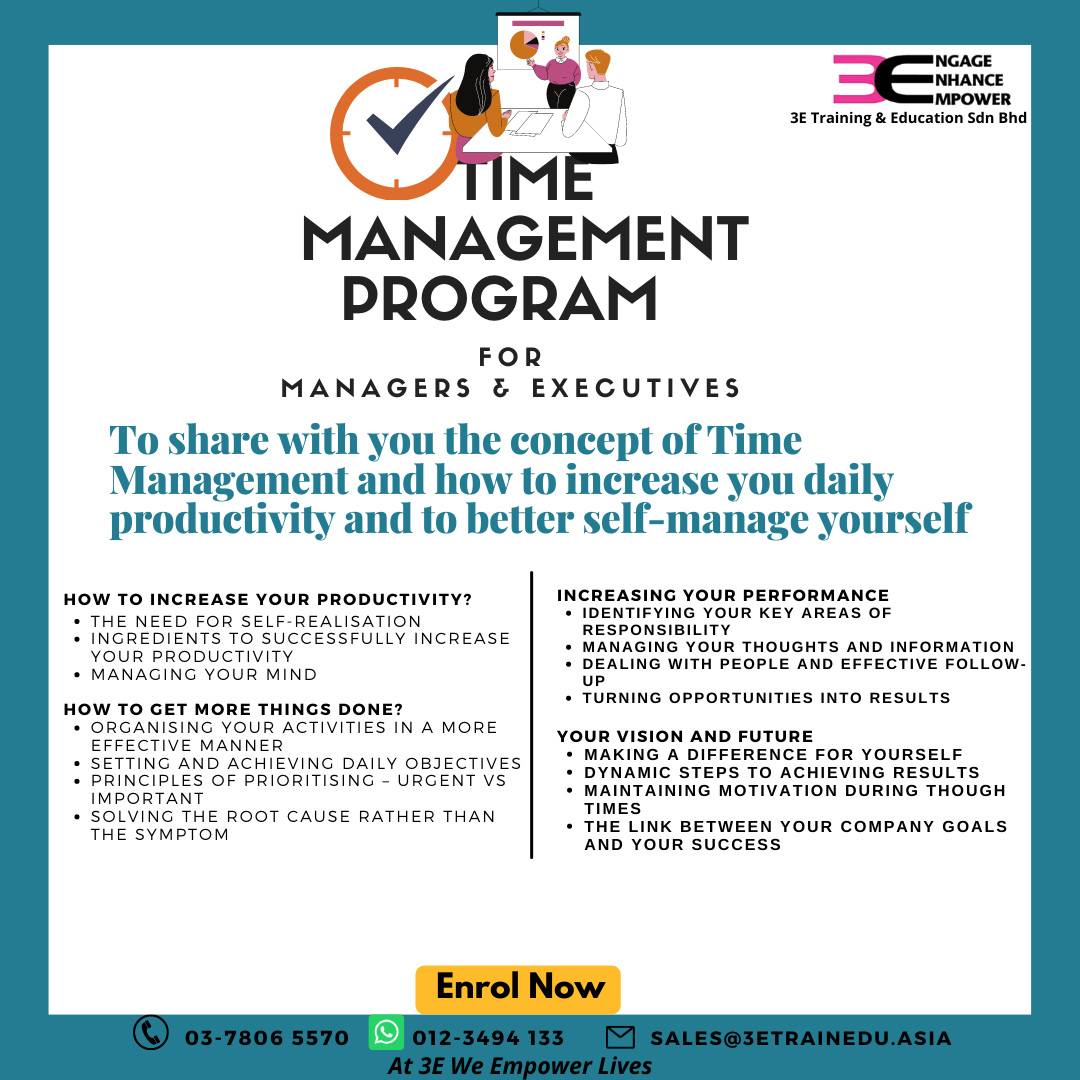 To share with participants the concept of Time Management and how to increase their daily productivity and to better self-manage themselves.