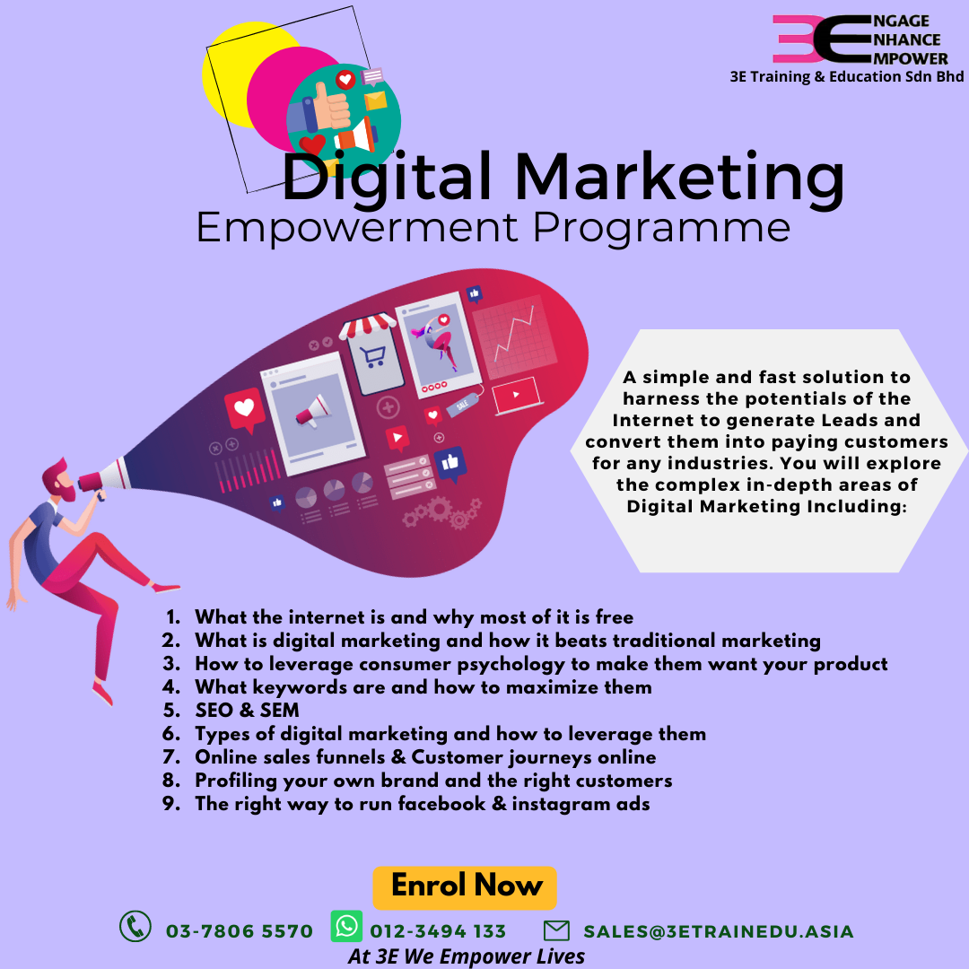 This program provides an analytical framework mainly on Online Marketing & Online Sales in order to harness the potentials of the Internet to generate Leads and convert them into paying customers for any industries. You will explore the complex in-depth areas of Digital Marketing Including: